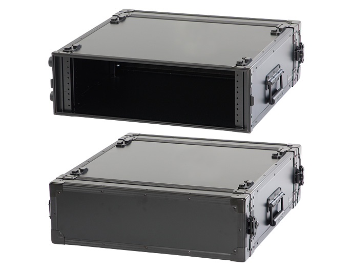 艶消しの黒を基調とした外観で従来品の40%軽量な外装板を使用した、フルカスタマイズ対応の音響・映像向け19インチラックケース(可搬ラック)