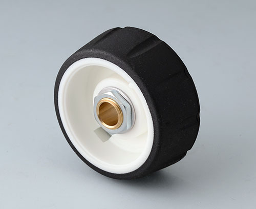 ●堅牢なポリカーボネ-ト製の本体と、機能的な溝を設け、滑り止め効果と心地よい手触りのTPE製グリップを一体成形させたノブです。