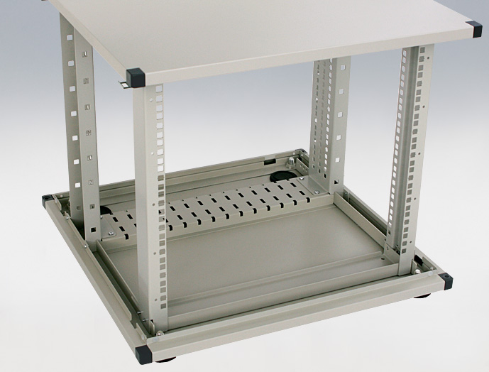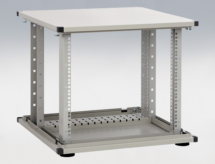 テーブル下部にアルミフレームラックを設けることで、デッドスペースの有効活用ができ、別途ラックが不要、当社の豊富なラックアクセサリーを使用できる等の多くのメリットを生みだします。