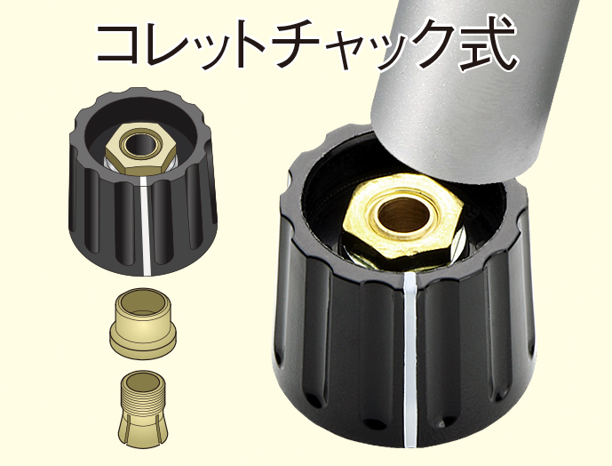 ●軸への固定は、多くの実績をもち、信頼性に定評のあるコレットチャック方式です。