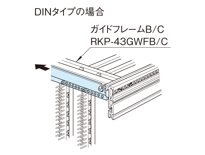 ●エッジボードタイプ及びDINタイプのコネクタに合わせて、それぞれ矢印の方向へDフレームの内壁にあたるまでスライドさせて固定します。